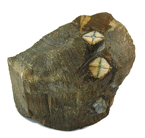Хиастолит — своеобразные индивиды андалузита из углисто-глинистых сланцев, в которых захваченное при росте кристаллов углистое или глинистое вещество распределено по определенным кристаллографическим направлениям таким образом, что в поперечном разрезе получается вид черного креста, а в продольном — параллельных удлинению кристалла темных полос на общем более светлом фоне.