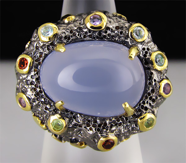 Кольцо из черненого стерлингового серебра 925 пробы с халцедоном (кабошон 18×11 мм), перидотами, аметистами, гранатами, голубыми топазами. Общая масса вставок 16,3 карат. Выборочное золочение. Площадка кольца — 28×23 мм, высота — 12 мм. Вес — 19 гр.