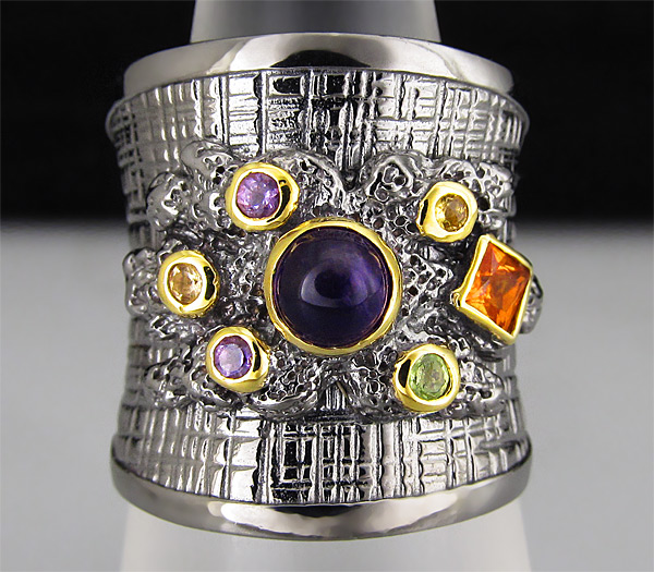 Кольцо из черненого стерлингового серебра 925 пробы с аметистом (кабошон 5 мм) и самоцветами. Выборочное золочение. Вес — 13,3 гр. Площадка — 24×22 мм.