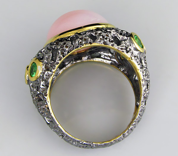 Кольцо из черненого стерлингового серебра 925 пробы с крупным розовым опалом и цаворитами. Выборочное золочение. Вес — 10,2 гр. Площадка кольца — 24×17 мм.