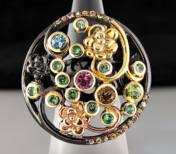 Кольцо из черненого стерлингового серебра 925 пробы с турмалином, цитрином, топазом, цаворитами гранатами и сапфирами. Выборочное золочение. Вес — 14,4 гр. Размер площадки — 32×32 мм.
