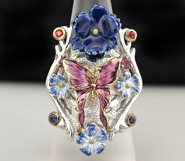 Кольцо из стерлингового родированного серебра 925 пробы с сапфирами, турмалинами и покрытием эмалью. Выборочное золочение. Вес — 14,1 гр. Размер площадки — 35×24 мм.