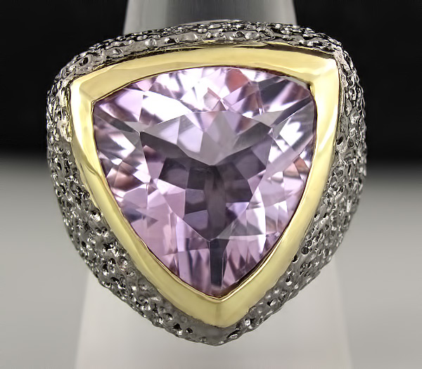 Кольцо из стерлингового родированного серебра 925 пробы с крупным аметистом триллионом (17 мм). Вес — 11,8 гр. Размер площадки — 24×24 мм. Выборочное золочение.