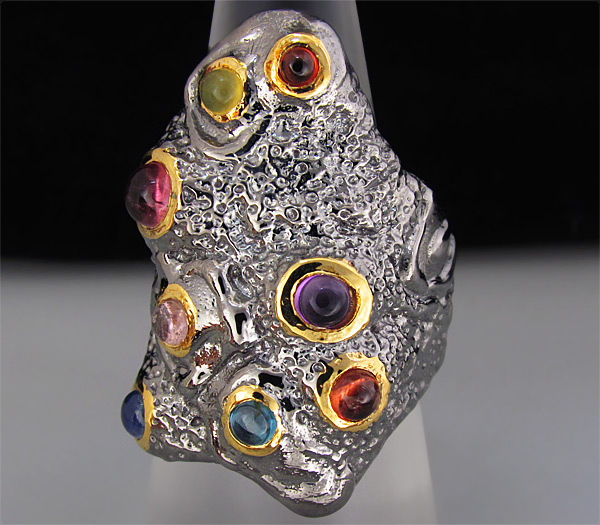 Кольцо из черненого стерлингового серебра 925 пробы с кабошонами опала, топаза, турмалина, сапфира и аметиста. Вес — 15,6 гр. Размер — 34×22 мм. Выборочное золочение.