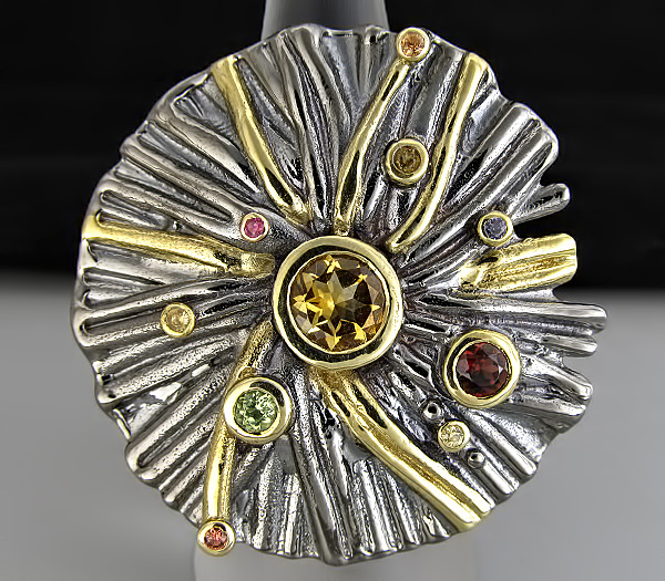 Кольцо из черненого стерлингового серебра 925 пробы с цитринами (от 2 до 7 мм), гранатом, перидотом и разноцветными сапфирами. Вес кольца — 14,9 гр. Площадка кольца — 40×40 мм. Выборочное золочение.
