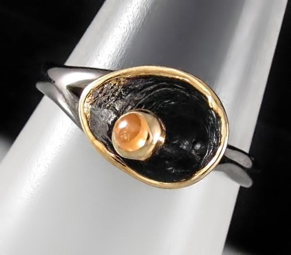 Кольцо из черненого стерлингового серебра 925 пробы с цитрином кабошоном (3 мм). Вес кольца — 3,4 гр. Площадка кольца — 10×8 мм. Выборочное золочение.