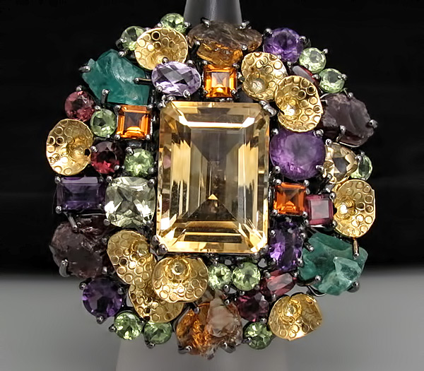Кольцо из черненого стерлингового серебра 925 пробы с цитринами, аметистами, апатитами, турмалинами, родолитами гранатами и перидотами. Вес кольца — 27,1 гр. Размер центральной вставки (13×18мм). Площадка кольца — 44×42 мм. Выборочное золочение.