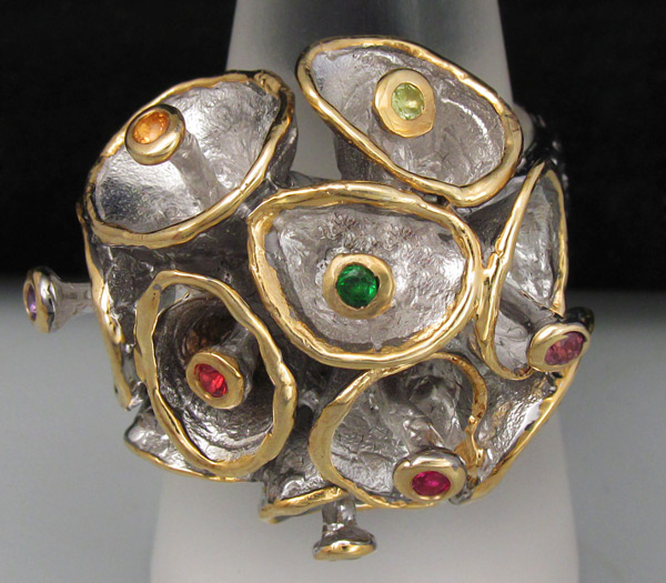 Кольцо из родированного матированного стерлингового серебра 925 пробы с сапфирами, перидотом, топазом, аметистом, цитрином, родолитом гранатом и цаворитом гранатом. Вес кольца — 24,9 гр. Площадка кольца — 29×27 мм. Выборочное золочение.