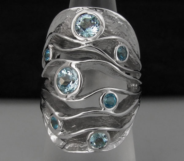 Кольцо из текстурного родированного стерлингового серебра 925 пробы с топазами. Вес кольца — 15,3 гр. Площадка кольца — 29×22 мм.