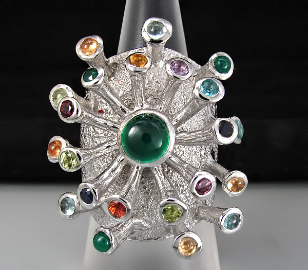 Кольцо из текстурного родированного стерлингового серебра 925 пробы с зелеными агатами, топазами, мозамбикскими и родолитами гранатами, цитринами, аметистами, перидотами и сапфирами. Вес кольца — 19,3 гр. Площадка кольца — 32×28 мм.