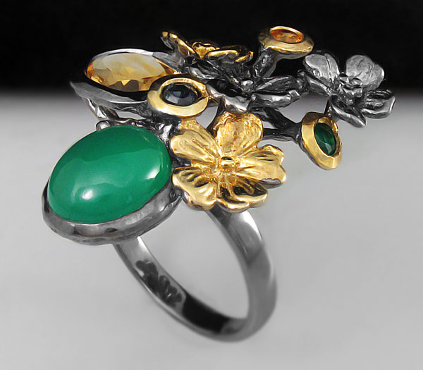 Кольцо из черненого серебра 925 пробы с зеленым агатом (кабошон 10×8 мм), цитрином (9×6 мм) и сапфирами. Вес кольца — 10,03 гр. Размер кольца — 18. Размер площадки 24×30 мм. Выборочное золочение.