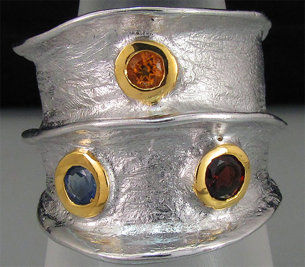 Кольцо из родированного стерлингового серебра 925 пробы с цитрином, гранатом и сапфиром. Вес кольца — 11,7 гр. Площадка кольца — 23×20 мм. Выборочное текстурирование и золочение.