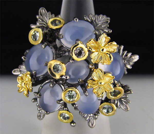 Кольцо из черненого стерлингового серебра 925 пробы с халцедоном и сапфирами. Вес кольца — 21,4 гр. Площадка кольца — 37×36 мм. Выборочное золочение.