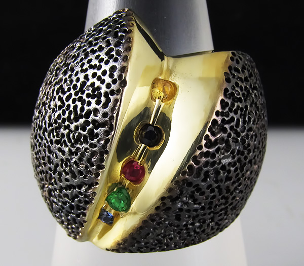 Кольцо из черненого стерлингового серебра 925 пробы с цаворитом гранатом и сапфирами. Вес кольца — 11,1 гр. Площадка кольца — 23×22 мм. Выборочное золочение.