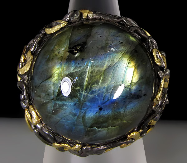 Кольцо из черненого стерлингового серебра 925 пробы с лабрадоритом. Вес кольца — 19,9 гр. Площадка кольца — 28×24 мм. Выборочное золочение.