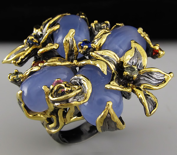 Кольцо из черненого стерлингового серебра 925 пробы с халцедоном и сапфирами. Вес кольца — 32,1 гр. Площадка кольца — 43×35 мм. Выборочное золочение.