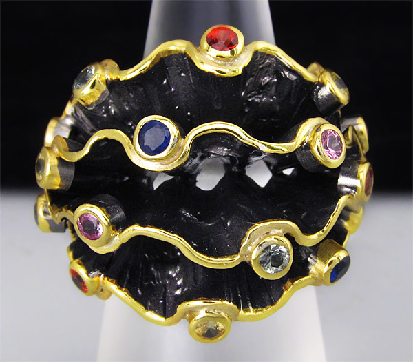 Кольцо из черненого стерлингового серебра 925 пробы с разноцветными сапфирами. Вес кольца — 17,5 гр. Площадка кольца — 30×15 мм. Выборочное золочение.