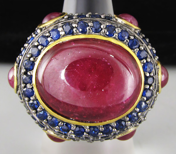 Кольцо из черненого стерлингового серебра 925 пробы с рубинами и сапфирами. Вес кольца — 25 гр. Площадка кольца — 33×27 мм. Выборочное золочение.