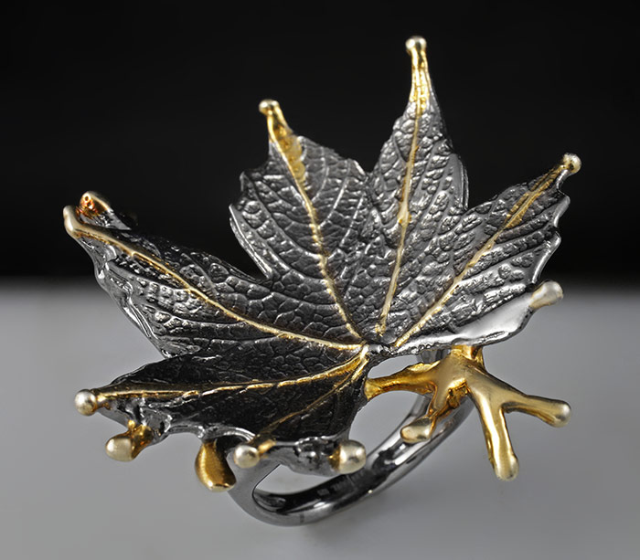 Кольцо-листок из серебра 925 пробы. Серебро 925, Золочение, Чернение Инкрустация: Без вставок Вес изделия: 20,8 грамм Размер: 17,75
