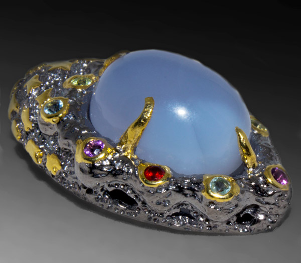 Кулон из черненого стерлингового серебра 925 пробы с халцедоном (кабошон 20×15 мм), гранатами, перидотами, аметистами и голубыми топазами. Общая масса вставок 24,05 карат. Выборочное золочение. Размер кулона — 42×26 мм. Вес — 19,1 гр.