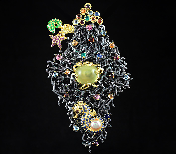 Серебро 925, Золочение, ЧернениеИнкрустация: Аметист, Гранат, Жемчуг, Сапфир, Турмалин, Цаворит гранат, ЦитринВес изделия: 46,2 граммРазмер: 95×53 мм