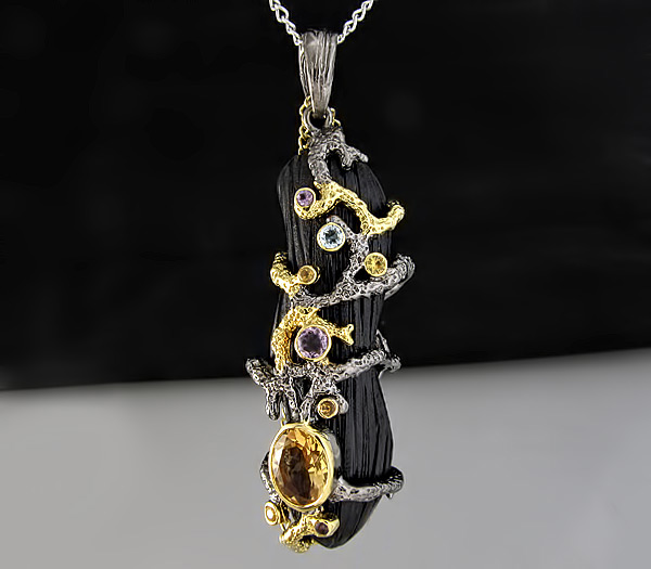 Кулон из дерева Sono и черненого стерлингового серебра 925 пробы с цитрином (10×7мм), аметистами, сапфирами и топазом. Вес — 12,56 гр. Размер кулона — 70×22 мм. Выборочное золочение.