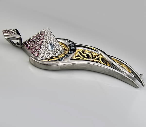 Кулон из черненого стерлингового серебра 925 пробы с родолитами гранатами и топазами. Вес — 33,85 гр. Размер кулона — 91×34 мм. Выборочное золочение.