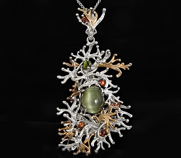 Кулон из родированного стерлингового серебра 925 пробы с разноцветными турмалинами кабошонами. Размер центральной вставки 14×16 мм. Вес — 31,3 гр. Размер кулона — 90×47 мм. Выборочное золочение.