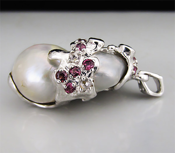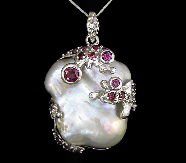 Кулон из стерлингового серебра 925 пробы с жемчугом и родолитами гранатами. Вес — 18,1 гр. Размер кулона — 42×27 мм.