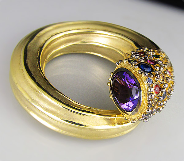 Серебро 925, Золочение, ЧернениеИнкрустация: Аметист, Сапфир, Цаворит гранатВес изделия: 41,3 граммРазмер: 48×45 мм