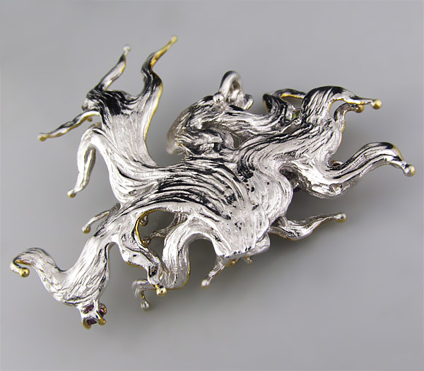 Кулон из стерлингового серебра 925 пробы с родолитом, цаворитами и мозамбикскими гранатами, аметистами, цитрином, топазами и перидотом. Вес — 23,6 гр. Размер кулона — 61×55 мм. Выборочное золочение.