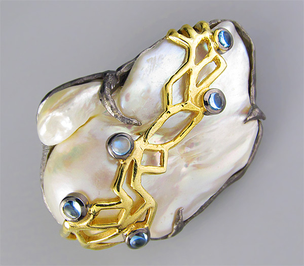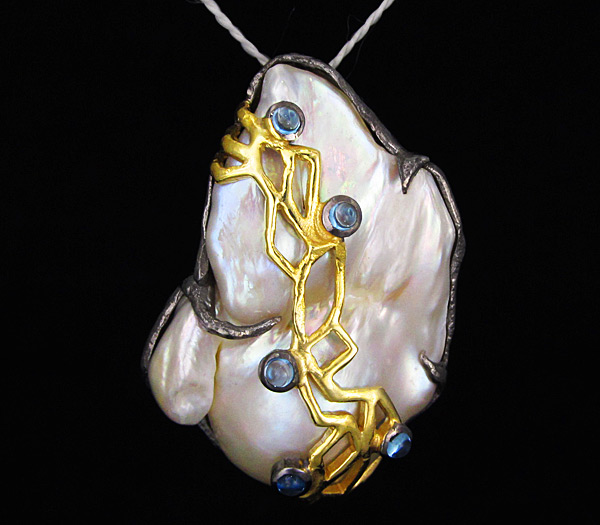 Кулон из черненого стерлингового серебра 925 пробы с жемчужиной и топазами. Вес 20,7 гр. Размер кулона — 40×30 мм. Выборочное золочение.