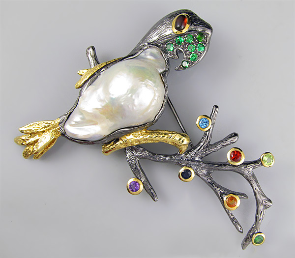 Брошь из черненого стерлингового серебра 925 пробы с жемчужиной, мозамбикским и цаворитами гранатами, аметистом, топазом, перидотом и сапфирами. Вес — 32,6 гр. Размер кулона — 71×63 мм. Выборочное золочение.