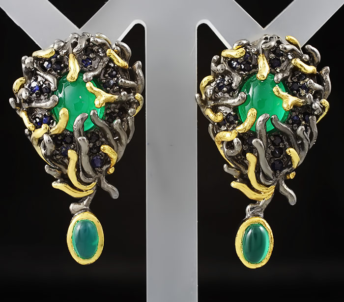 Серьги из черненого стерлингового серебра 925 пробы с зелеными агатами (кабошон 9×7 мм) и сапфирами (1 мм). Общая масса вставок — 8,25 карат. Выборочное золочение. Размер серег — 34×20 мм. Вес — 19,4 гр.