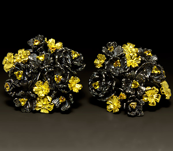 Серьги из черненого стерлингового серебра 925 пробы с разноцветными сапфирами. Выборочное золочение. Вес — 23,2 гр. Размер серег — 32×31 мм.