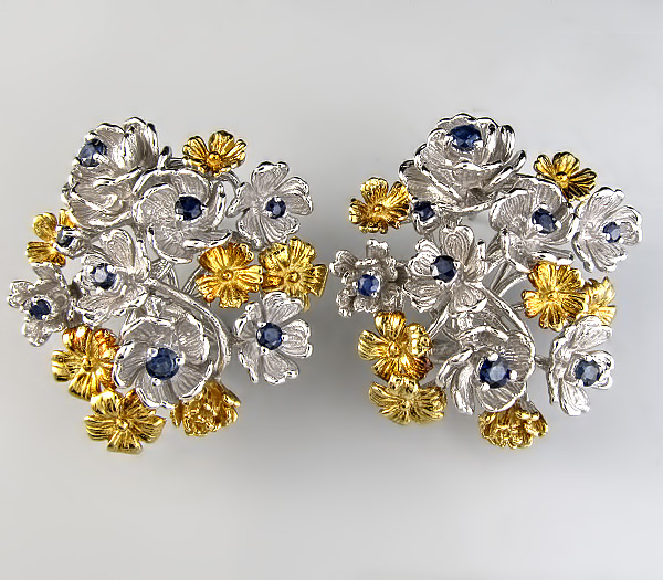 Серьги из родированного стерлингового серебра 925 пробы с синими сапфирами. Вес — 23,6 гр. Размер серег — 33×30 мм. Выборочное золочение.