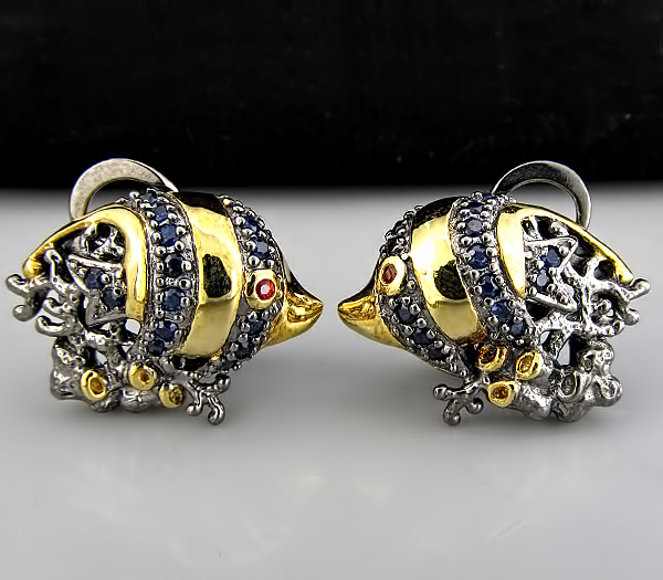 Серьги из черненного стерлингового серебра 925 пробы с сапфирами. Вес — 11,85 гр. Размер серег — 24×17 мм. Выборочное золочение.