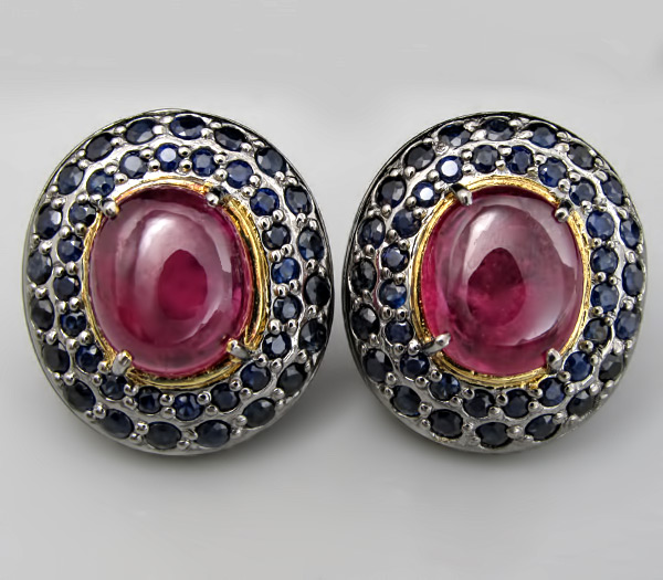 Серьги из черненного стерлингового серебра 925 пробы с сапфирами. Размер центральных сапфиров кабошонов 13×11 мм. Вес — 25 гр. Размер серег — 26×23 мм. Выборочное золочение.