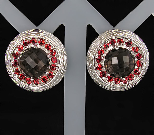 Серьги из текстурного родированного стерлингового серебра 925 пробы с дымчатыми топазами (11мм) и гранатами. Вес — 20,1 гр. Размер серег — 23×23 мм.