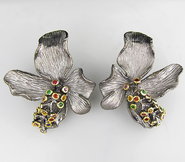 Серьги из черненого стерлингового серебра 925 пробы с аметистами, цитринами, разноцветными сапфирами, цаворитами и мозамбикскими гранатами. Вес — 20,1 гр. Размер серег — 38×32 мм. Выборочное золочение.