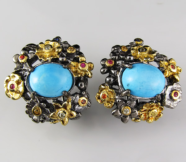 Серьги из черненого стерлингового серебра 925 пробы с бирюзой и разноцветными сапфирами. Вес — 16,4 гр. Размер серег — 23×21 мм. Выборочное золочение.