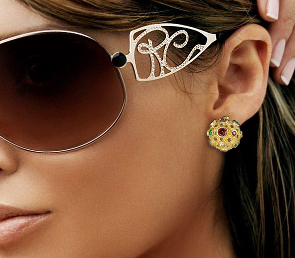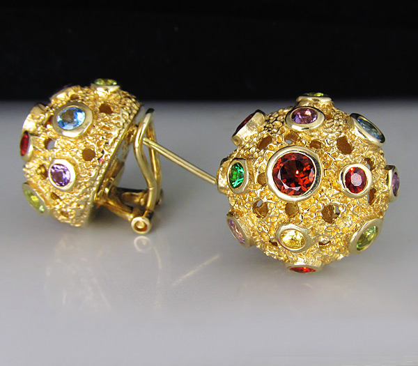 Серьги из позолоченного стерлингового серебра 925 пробы с мозамбикскими и цаворитами гранатами, аметистами, перидотами, топазами и сапфирами. Вес — 12,8 гр. Размер серег — 19×19 мм.