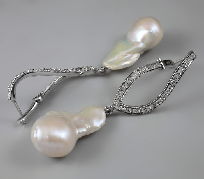Серьги из стерлингового серебра 925 пробы с пузырчатым жемчугом и бесцветными топазами. Вес — 13,5 гр. Размер серег — 66×14 мм.