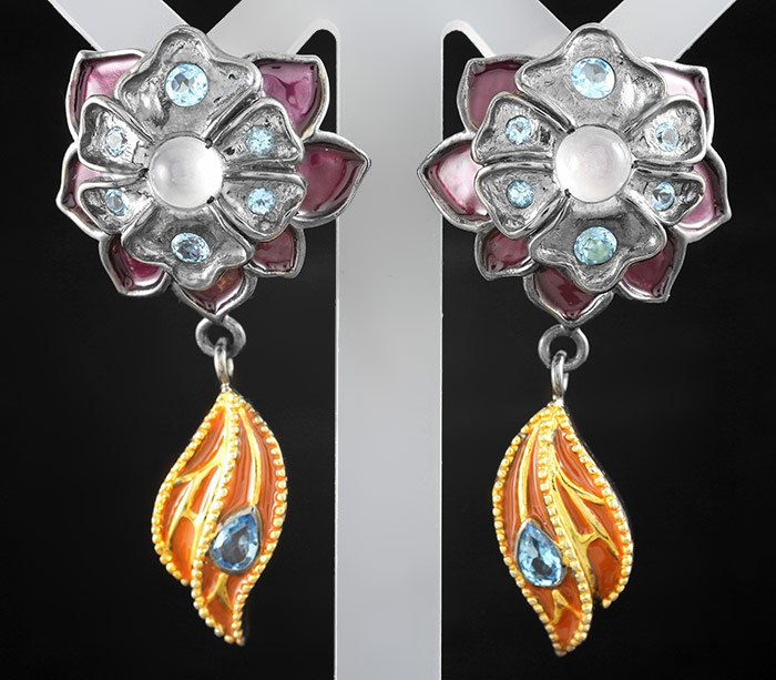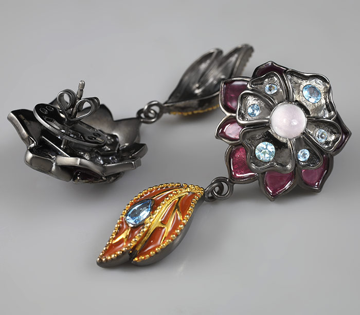 Серьги из черненого стерлингового серебра 925 пробы с розовым кварцем и топазами. Вес — 17,1 гр. Размер серег — 46×24 мм. Выборочное золочение и покрытие эмалью.