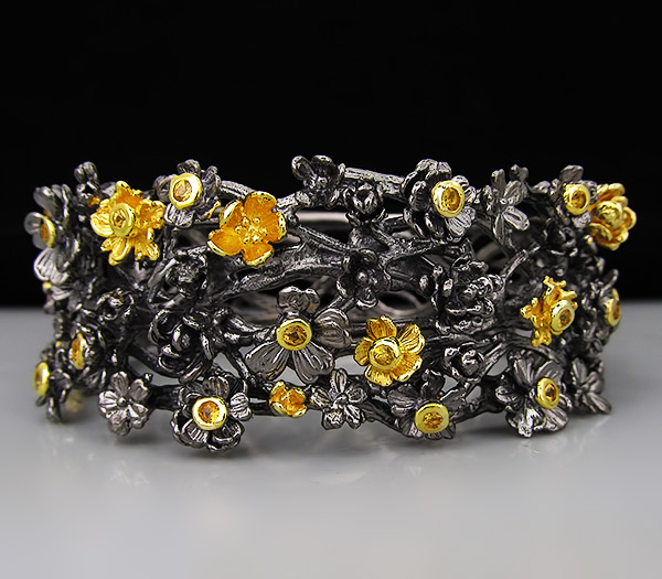 Браслет из черненого стерлингового серебра 925 пробы с разноцветными сапфирами. Выборочное золочение. Вес — 72.6 гр. Размер браслета — 73×29 мм.