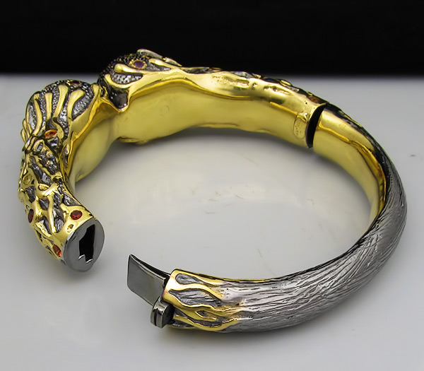 Браслет из черненого стерлингового серебра 925 пробы с самоцветами. Выборочное золочение. Вес — 65,5 гр. Размер площадки — 77×20 мм.