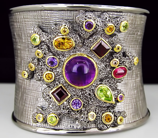 Браслет из серебра 925 пробы с самоцветами.Серебро 925, Золочение, Чернение Инкрустация: Аметист, Гранат, Перидот, Сапфир, Цитрин Вес изделия: 68,8 грамм Размер: 50×48 мм