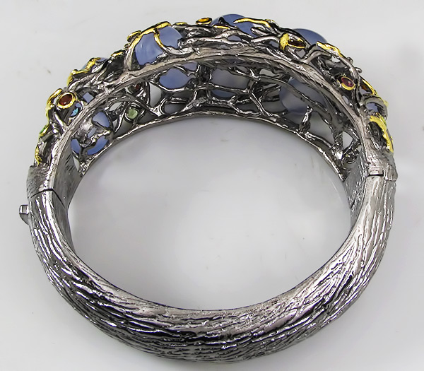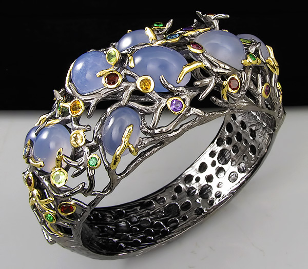 Браслет из черненого стерлингового серебра 925 пробы с халцедоном, аметистами, гранатами, перидотами, топазами, цаворит гранатами и цитринами. Вес — 86,9 гр. Площадка браслета — 74×31 мм. Выборочное золочение.