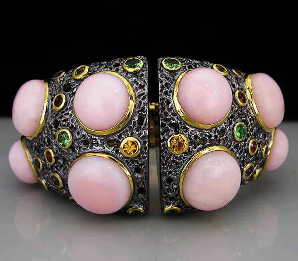 Браслет из черненого стерлингового серебра 925 пробы с крупными розовыми опалами кабошонами, аметистами, гранатами, перидотами, сапфирами, цаворит гранатами. Вес — 92,5 гр. Площадка браслета — 77×39 мм. Выборочное золочение.