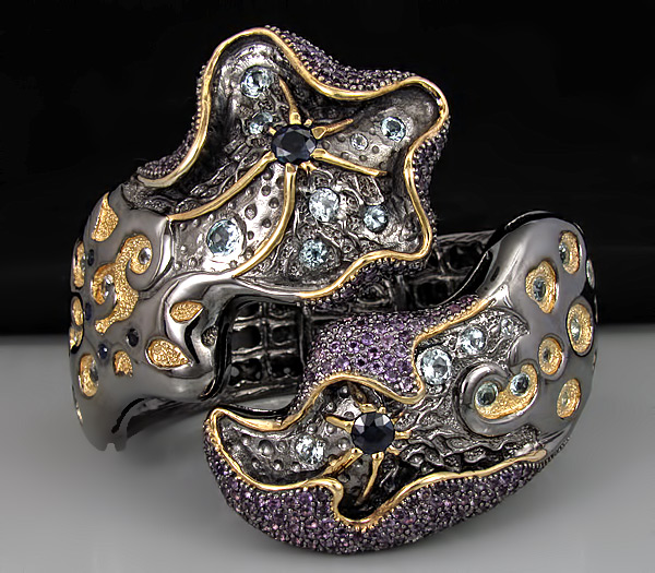 Браслет из черненого стерлингового серебра 925 пробы с аметистами, топазами и сапфирами. Вес браслета — 91,7 гр. Площадка браслета — 74×62 мм. Выборочное золочение.